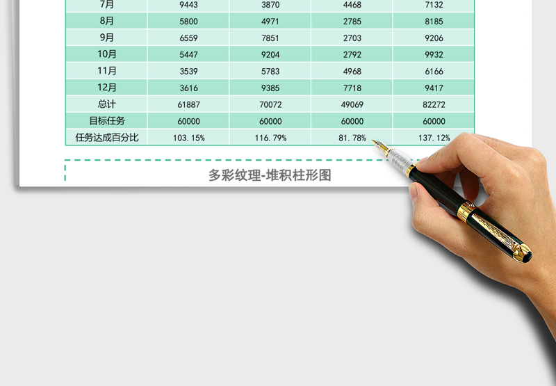 表格大全网提供2025绿色员工业绩统计堆积柱形图Excel模板模板供会员下载,作品格式为xlsx。更多精彩销售/采购素材,尽在表格大全网。