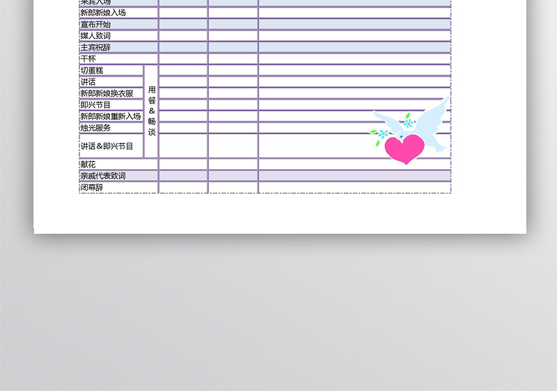 表格大全网提供婚宴程序表excel模板模板供会员下载,作品格式为。更多精彩个人素材,尽在表格大全网。