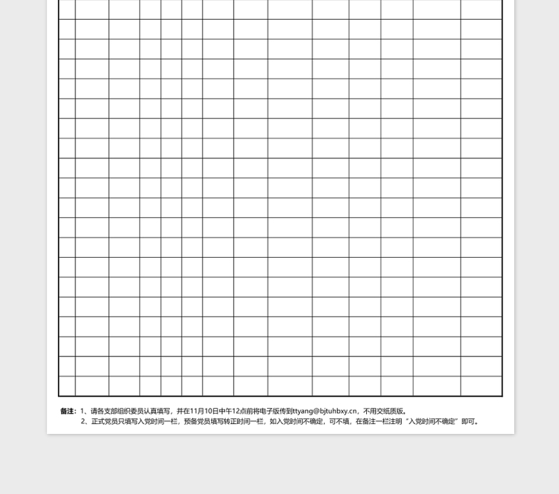 备注:1、请各支部组织委员认真填写,并在11月10日中午12点前将电子版传到ttyang@bjtuhbxy.cn,不用交纸质版。