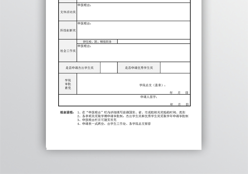 1、在“申报理由”栏内详细填写获得国家、省、市或校相关奖励的时间、类别 2、各单项奖采取学期申请审批制,杰出学生奖和优秀学生奖采取学年申请审批制 3、申报理由栏目可附页补充 4、申请表一式两份,由学生工作处、各学院总支留存