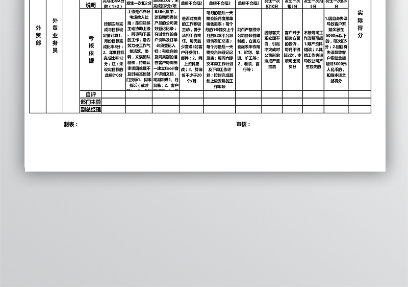 表格大全网提供外贸部绩效考核表格模板供会员下载,作品格式为。更多精彩人事素材,尽在表格大全网。