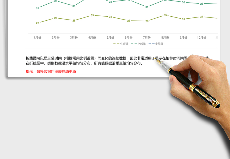 折线图可以显示随时间(根据常用比例设置)而变化的连续数据,因此非常适用于显示在相等时间间隔下数据的趋势。 在折线图中,类别数据沿水平轴均匀分布,所有值数据沿垂直轴均匀分布。