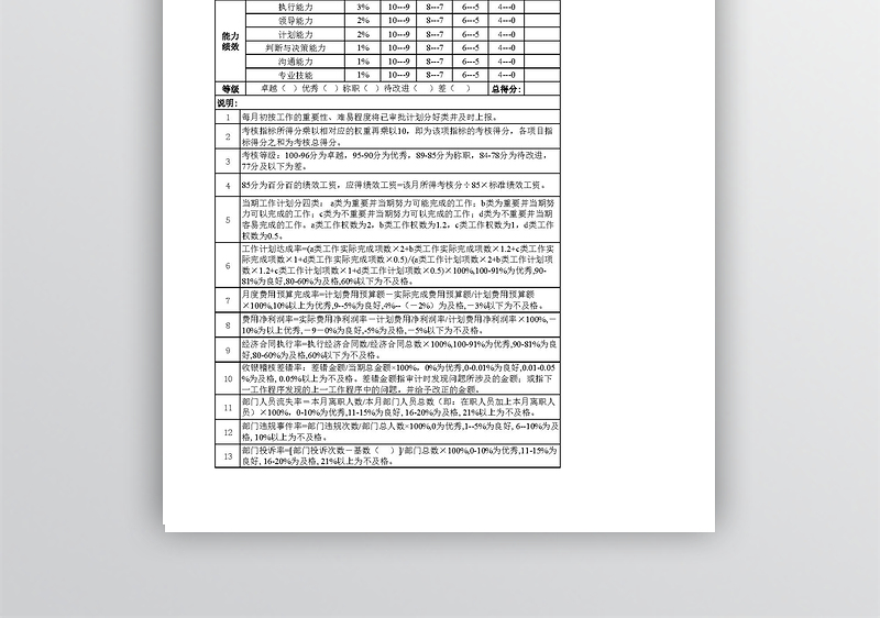 考核等级:100-96分为卓越,95-90分为优秀,89-85分为称职,84-78分为待改进,77分及以下为差。