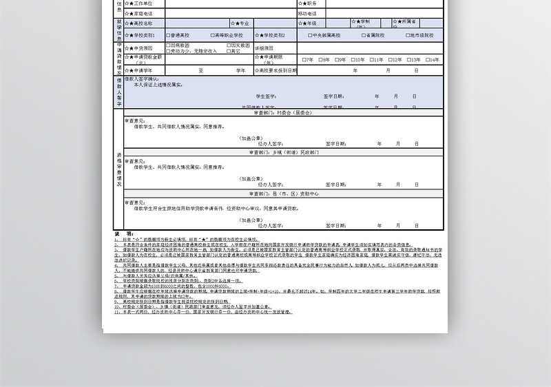 1、 标有“☆”的数据项为新生必填项,标有“★”的数据项为在校生必填项。 2、 本表是符合条件的家庭经济困难的普通高校新生或在校生,入学前在户籍所在地向国家开发银行申请助学贷款的申请表。申请学生须如实填写表内的各类信息。 3、 借款学生户籍所在地应与资助中心所在地一致;如借款人为新生,必须是已被国家教育主管部门认定的普通高等职业学校正式录取,并取得真实、合法、有效的录取通知书的学生,如借款人为在校生,必须是已被国家教育主管部门认定的普通高校或高等职业学校正式录取的学生;借款学生家庭确实为经济困难家庭,借款学生需诚实守信、遵纪守法、无违法违纪记录。 4、 共同借款人主要是指借款学生父母、其他近亲属或者其他自愿与借款学生共同承担还款责任的具备完全民事行为能力的自然人。如借款人为孤儿,应从后两类中选择共同借款人,不能提供共同借款人的,经县资助中心请示省教育部门同意也可申请贷款。 5、 与借款人关系应选择父母/近亲属/其他。 6、 学校类别根据录取院校的性质分别在类别1、类别2中各选择一项。 7、 申请贷款金额为1000到6000之间的整数,包含1000和6000。 8、 借款学生应根据在校年限选择申请贷款的期限。申请贷款期限的上限=学制-年级+1+10,并最长不超过14年。如:学制四年的大学二年级在校生申请第三学年助学贷款,按照前述规则,其申请的贷款期限的上限为12年。 9、 高校规定报到日期是指借款学生就读院校规定的报到日期。 10、村委会(居委会)、乡镇(街道)民政部门审查意见,须经办人签字并加盖公章。 11、本表一式两份,经办资助中心存一份,国家开发银行存一份,由经办资助中心统一发放管理。