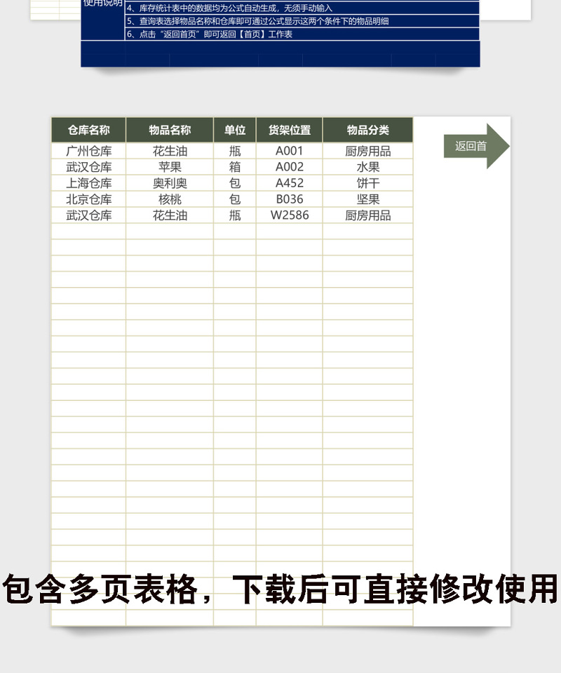1、请先在参数设置表中设置好【仓库名称】【物品名称】【单位】【货架位置】及【物品分类】