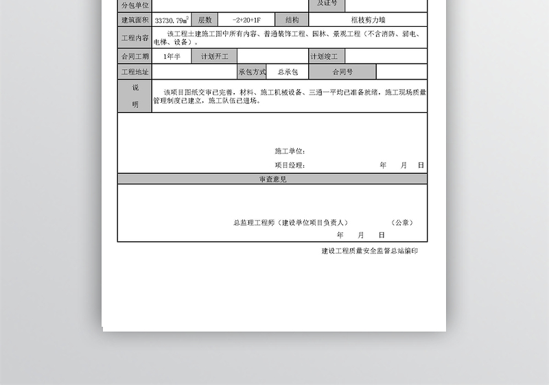 标签:开工复审报告模板,1920x1080:300DPI,EXCEL文档,下载,EXCEL白色,免费模板EXCEL格式,公司文档,文件,合同,打印合同,电子文档,EXCEL模板,商务,商务文档,简洁大方,可编辑文档,,,,开工复审报告