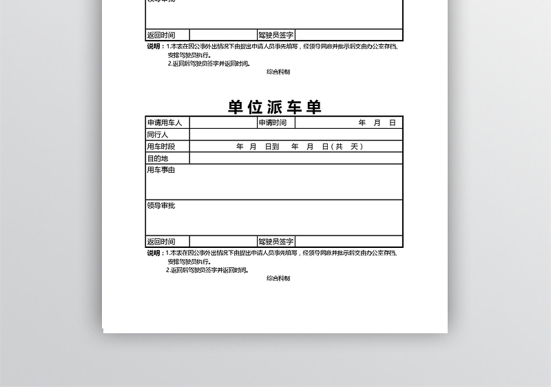 说明:1.本表在因公事外出情况下由提出申请人员事先填写,经领导同意并批示后交由办公室存档、 安排驾驶员执行。 2.返回后驾驶员签字并返回时间。 综合科制