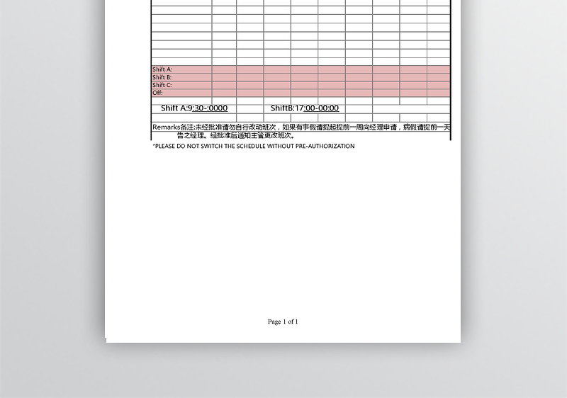 Remarks备注:未经批准请勿自行改动班次,如果有事假请提起提前一周向经理申请,病假请提前一天