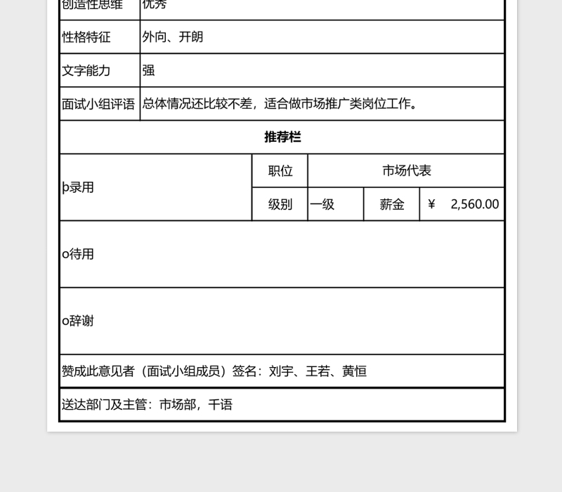 表格大全网提供2025面试结果推荐表excel模板模板供会员下载,作品格式为xls。更多精彩个人素材,尽在表格大全网。