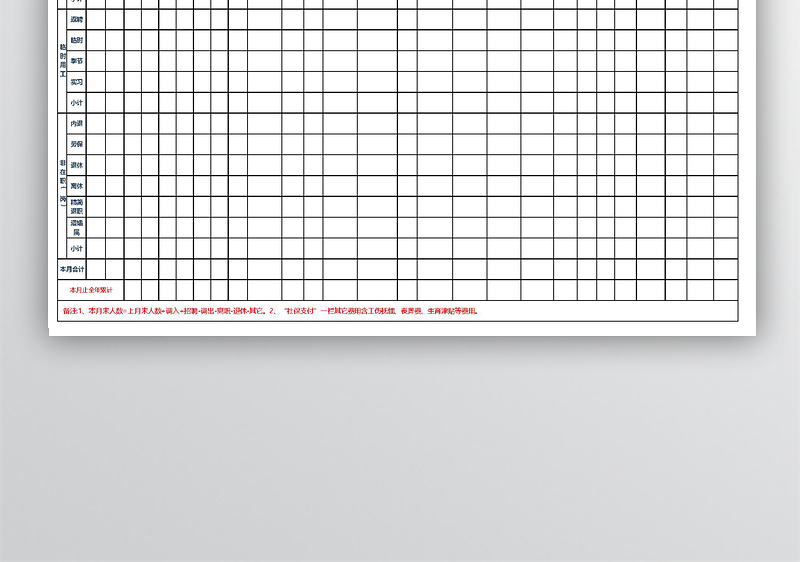 备注:1、本月末人数=上月末人数+调入+招聘-调出-离职-退休-其它。2、“社保支付”一栏其它费用含工伤抚恤、丧葬费、生育津贴等费用。