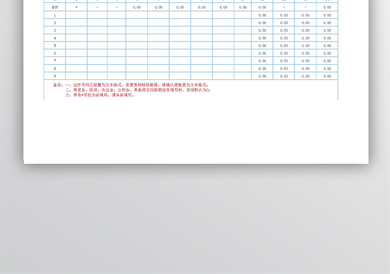 备注:一、证件号码已设置为文本格式,若要复制粘贴数据,请确认源数据为文本格式; 二、养老金、医保、失业金、公积金、其他项目扣除额没有填写时,系统默认为0; 三、带有*号的为必填项,请务必填写。