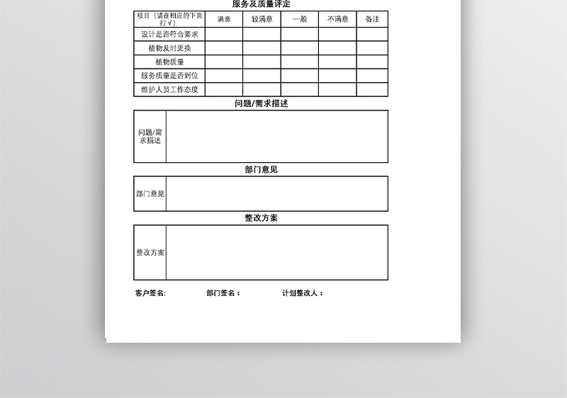衷心的感谢您对我们公司的信任和支持。为了不断提高我们公司工作效率和服务质量,完善我们的工作,为了给你提供更好的绿化环境及服务。在致以我们诚挚问候的同时,请您在百忙之中填写以下意见反馈。我们热切的期盼着您对我们的工作提出宝贵的意见和建议,我们将不胜感激,谢谢!