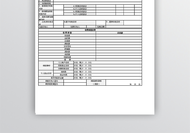 标签:医保普通住院病员医疗费用结算单,高清图片设计素材,1920x1080:0DPI,EXCEL文档,下载,EXCEL白色,免费模板EXCEL格式,公司文档,文件,合同,打印合同,电子文档,EXCEL模板,商务,商务文档,简洁大方,可编辑文档