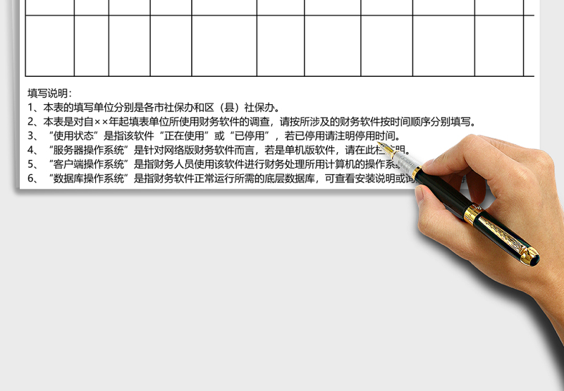 填写说明: 1、本表的填写单位分别是各市社保办和区(县)社保办。 2、本表是对自××年起填表单位所使用财务软件的调查,请按所涉及的财务软件按时间顺序分别填写。 3、“使用状态”是指该软件“正在使用”或“已停用”,若已停用请注明停用时间。 4、“服务器操作系统”是针对网络版财务软件而言,若是单机版软件,请在此栏注明。 5、“客户端操作系统”是指财务人员使用该软件进行财务处理所用计算机的操作系统。 6、“数据库操作系统”是指财务软件正常运行所需的底层数据库,可查看安装说明或询问技术支持。