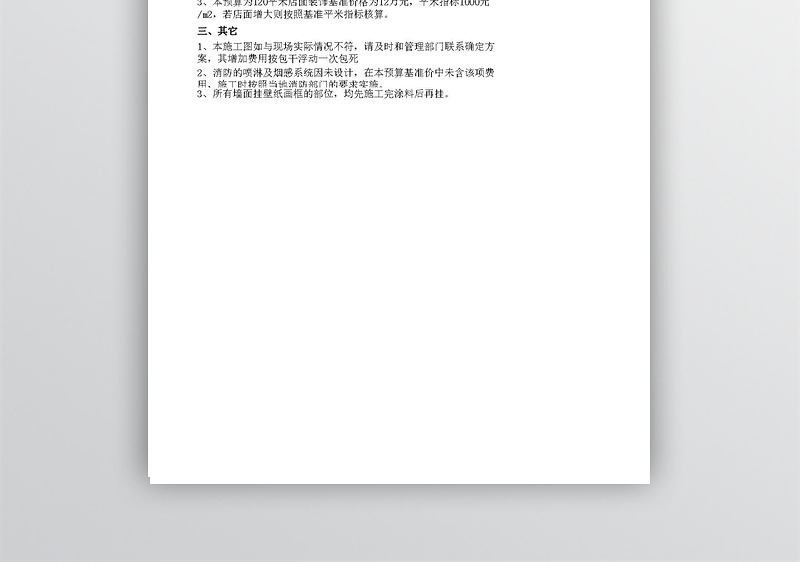 3、本预算为120平米店面装饰基准价格为12万元,平米指标1000元/m2,若店面增大则按照基准平米指标核算。