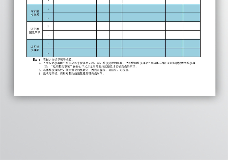 注:1、责任人指领导班子成员。 2、“立行立改事项”指活动以来发现的问题,现已整改完成的事项;“近中期整改事项”指2014年9月底前能够完成的整改事 项;“远期整改事项”指2014年10月之后需要持续整改才能够完成的事项。 3、具体整改措施栏,能够量化的要量化,做到可操作、可监督、可检查。 4、完成时限栏,要针对整改措施注意明确完成时间。
