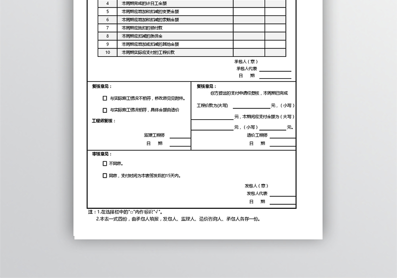 2.本表一式四份,由承包人填报,发包人、监理人、造价咨询人、承包人各存一份。