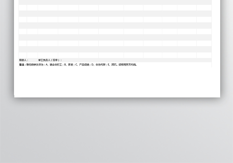 备注:勤功助学类型为:A、进企业打工;B、家教;C、产品促销;D、业务代理;E、其它。请填写英文代码。