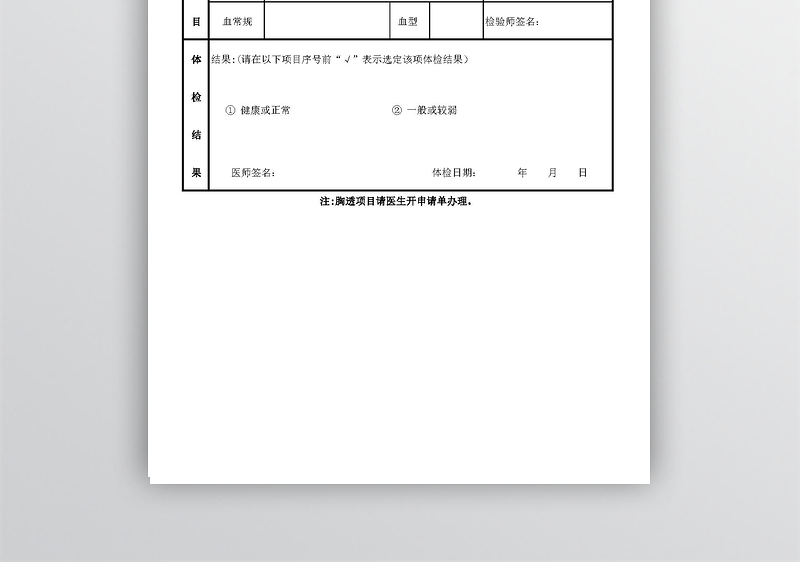 标签:员工入职体检表模板,1920x1080:0DPI,EXCEL文档,下载,EXCEL白色,免费模板EXCEL格式,公司文档,文件,合同,打印合同,电子文档,EXCEL模板,商务,商务文档,简洁大方,可编辑文档,,,,员工入职体检表,入职体检表模板
