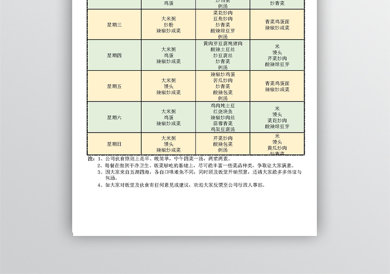 注:1、公司伙食原则上是早、晚简单,中午四菜一汤,两荤两素。