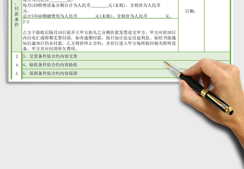 2-2 乙方于验收后隔月10日前开立甲方抬头之分期价款发票送交甲方,甲方应於20日内以电汇或即期支票付清,如有逾期付款,按日加计法定迟延利息。如经书面通知后逾30日仍未付款,乙方得於终止合约,并径行进入甲方场所取回相关照明设备,甲方并应付清所欠费用。