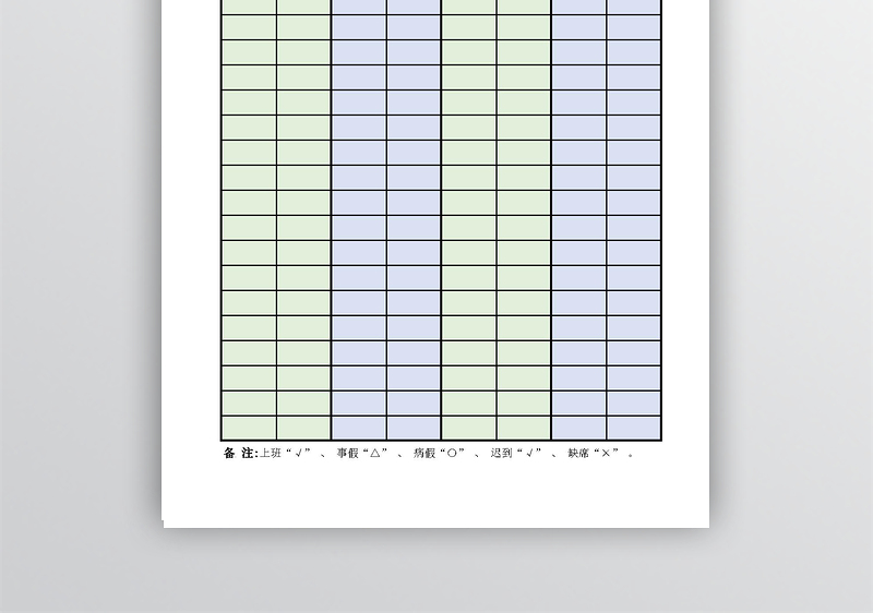 备 注:上班“√” 、 事假“△” 、 病假“○” 、 迟到“√” 、 缺席“×” 。